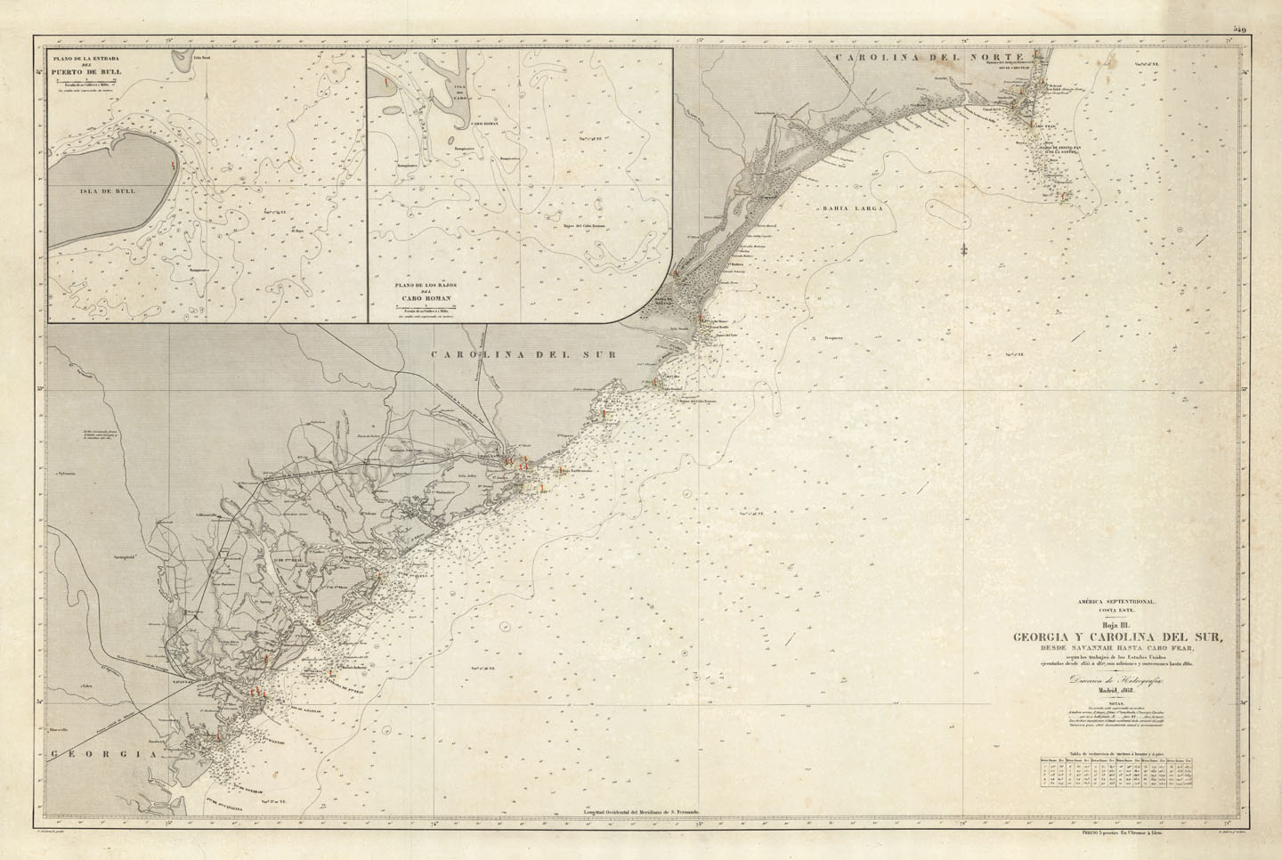 DESCRIPTION: A fine Spanish produced sea chart of the southeast coast line. This highly detailed chart covers an area from Cape Fear southward to St. Simons Island. The two inset maps are of the northern point of Bull Island and Cape Roman. The Direccion de Hidrografia was the official Spanish government agency for issuing nautical charts. These charts issued by them are seldom seen in the market.