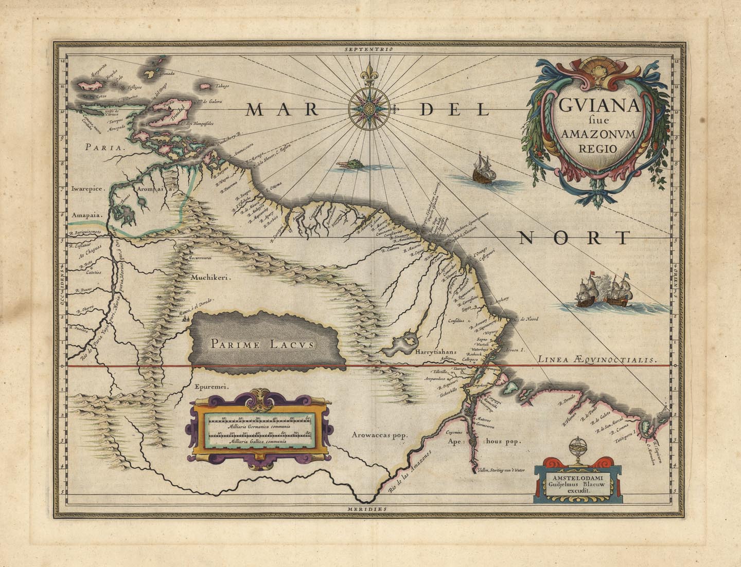 DESCRIPTION: A beautiful map depicting Guyana, Suriname, French Guiana, and part of Brazil from Blaeu's "Theatrum Orbis Terrarum, Sive Atlas Novis." The map shows the Amazon River into the interior of the continent and locates the mythical city of El Dorado or Manoa, aka, the fabled city of gold. The map is embellished with title and scale cartouches, a large compass rose, a sea monster and sailing ships.