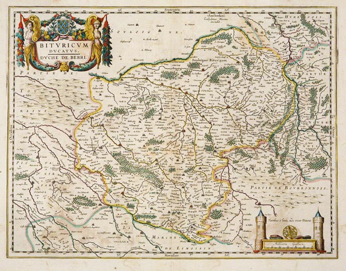 DESCRIPTION: A decorative map of region of central France. The cities of Bourges and Nevers are shown. Embellished with a handsome title cartouche and a distance scale flanked by two stone castle towers.