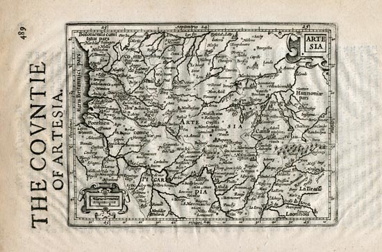 DESCRIPTION: The English subtitle for this map is "The Countie of Artesia." This map was first issued by Jodocus Hondius, appearing in his "Atlas Minor" which itself was a reduced version of Mercator’s "Atlas." In the early 1620's The original copper plates were obtained by several London booksellers and were reprinted in "Purchas His Pilgrimage" (1624-26) and "Historia Mundi or Mercators Atlas." (1635, 37 and 39) This particular impression appeared in the 1637 edition of "Historia Mundi" published by Michaell Sparke. Sparke supplemented the original titles with English titles in the left margin. A scarce English language edition.