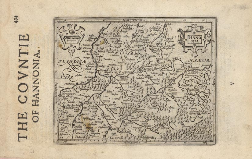 DESCRIPTION: The English subtitle for this map is "The countie of Hannonia." This map was first issued by Jodocus Hondius, appearing in his "Atlas Minor" which itself was a reduced version of Mercator’s "Atlas." In the early 1620's The original copper plates were obtained by several London booksellers and were reprinted in "Purchas His Pilgrimage" (1624-26) and "Historia Mundi or Mercators Atlas." (1635, 37 and 39) This particular impression appeared in the 1637 edition of "Historia Mundi" published by Michaell Sparke. Sparke supplemented the original titles with English titles in the left margin. A scarce English language edition.