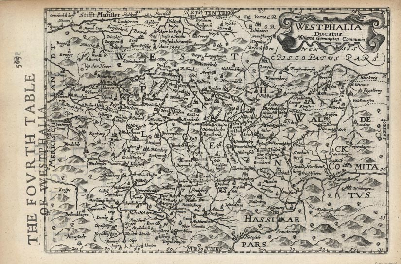 DESCRIPTION: The English subtitle for this map is "The Fourth Table of Westphalia." This map was first issued by Jodocus Hondius, appearing in his "Atlas Minor" which itself was a reduced version of Mercator’s "Atlas." In the early 1620's The original copper plates were obtained by several London booksellers and were reprinted in "Purchas His Pilgrimage" (1624-26) and "Historia Mundi or Mercators Atlas." (1635, 37 and 39) This particular impression appeared in the 1637 edition of "Historia Mundi" published by Michaell Sparke. Sparke supplemented the original titles with English titles in the left margin. A scarce English language edition.