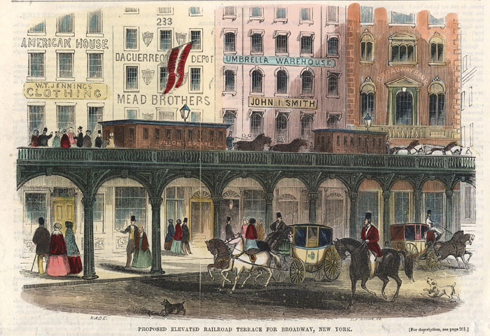 DESCRIPTION: Horse drawn railroad cars. The exterior of Mead Brothers Daguerreotype Gallery can be seen.