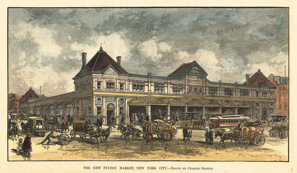 DESCRIPTION: New Fulton Market, New York City (Harper's Weekly print) This engaging print from Harper's Weekly captures the vibrant hustle and bustle of the New Fulton Market in New York City. The scene is bustling with activity, showcasing an array of marketgoers and vendors amidst the architectural charm of the newly established market space. The detailed illustration reflects the dynamic nature of urban life, highlighting the interactions and commerce that characterize daily life in one of the city's most frequented markets.