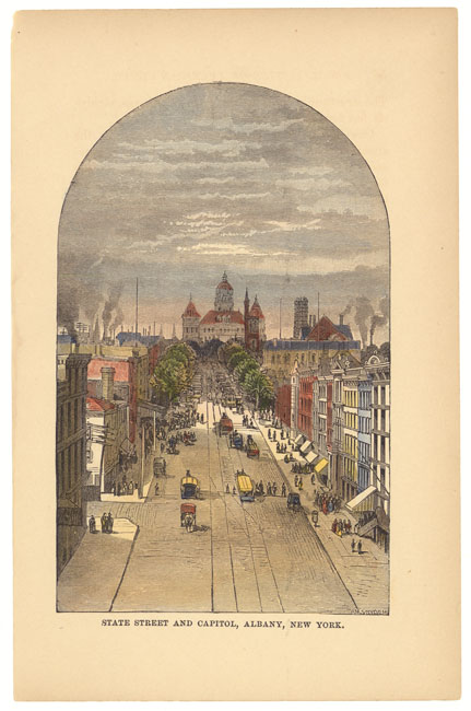 DESCRIPTION: Bird's eye view up State Street - great details and nicely colored.