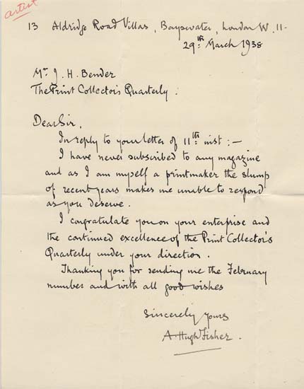 DESCRIPTION: One page hand written to J. H. Bender Alden Galleries, Kansas City Mo. (also publisher of the Print Collectors Quaterly), dated 29th March 1938. Starts off "In reply to your letter of 11th inst: - I have never subscribed to any magazine and as i am myself a printmaker the slump of recent years makes me unable to respond as you deserve." Signed in ink.
