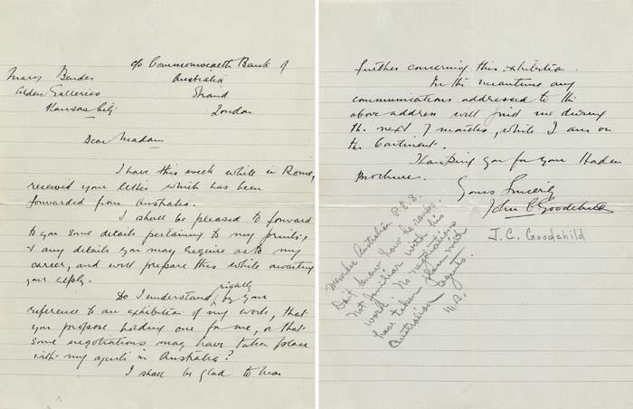 DESCRIPTION: Two page hand written to Mary Bender, wife of J. H. Bender Alden Galleries, Kansas City Mo. (also publisher of the Print Collectors Quaterly), dated Dec. 28, 1940. Letter begins "I have this week while in Rome, received your letter which has been forwarded from Australia...." Signed in ink. Notes on letter by Mary Bender in pencil, "Member Australian P.E.S. don't know how he ranks. Not familiar with his work. No negotiations have take place with Australian agents. M.B." Artist name also written in pensil by Mary Bencer.