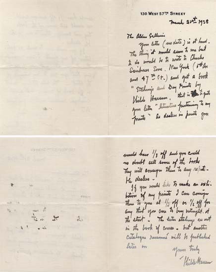 DESCRIPTION: Two folded pages on printed letterhead hand written to J. H. Bender Alden Galleries, Kansas City Mo. (also publisher of the Print Collectors Quaterly), dated March 21 1928. Letter starts out "Your letter (no date) is at hand. The thing it would seem to me best to do would be to write to Charles Scribners Sons, New York (6th Ave and 47th St.) and get a book 'Etching's and Dry Points by Childe Hassam'" Signed in ink.