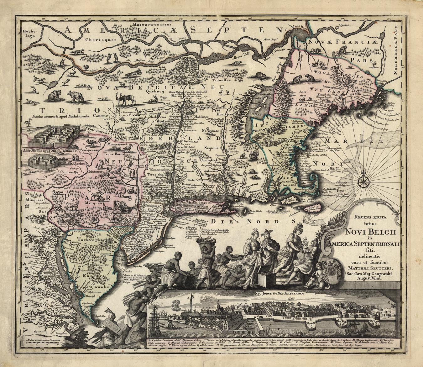 DESCRIPTION: One of the Jansson-Visscher series of New England maps. This series began in 1651 with a map by Jansson and ended over a century later with a version by Lotter. When it first appeared, it was cutting edge cartography. By the time the Lotter edition was printed, it was badly outdated. Among the many errors, Lake Champlain is located east of the Connecticut River. Geographic errors aside, the map is quite beautiful. Within the map are engraved many birds and animals including turkeys, herons, bears, moose, foxes, rabbits, and beavers. There are also images of a circular and rectangular Indian village. In the lower right corner is the “Restitutio view” of the New York City entitled “Neu Jorck sive Neu Amsterdam.” This view first appeared on the Hugo Allard printing of the map in 1674 and shows the city at the time of the Dutch reconquest in 1673. To the left and above the view is an elaborate scene depicting natives and gods presenting tribute to the English monarch, George II.