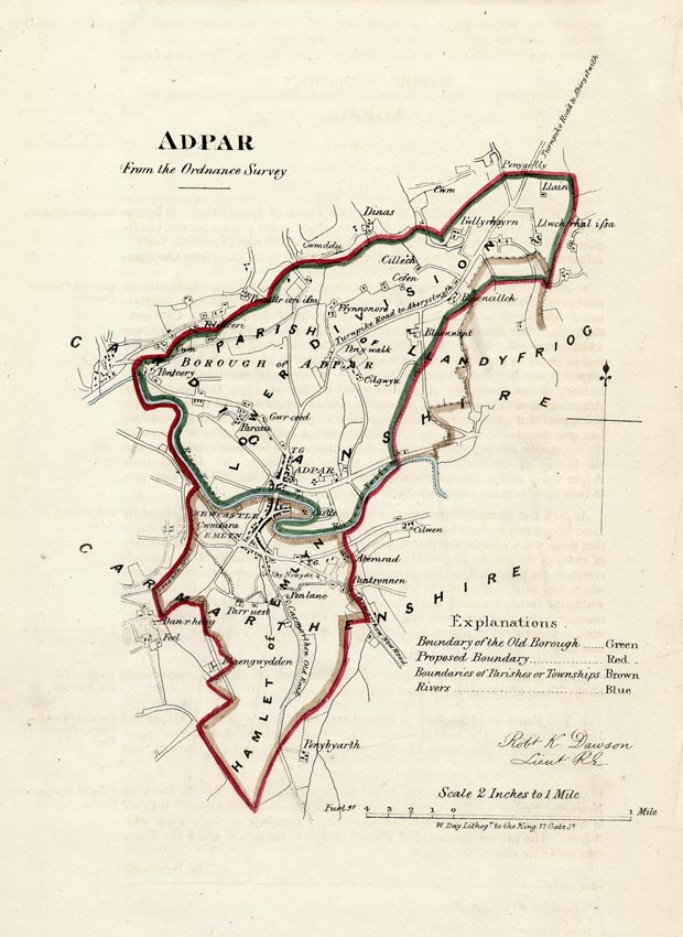 DESCRIPTION: A plan of the town of Adpar. Adpar is located in the mid Teifi valley on the borders of Cardiganshire and Carmarthenshire, West Wales. Drawn on a scale of two inches to one mile. Drawn on stone by W. Day.