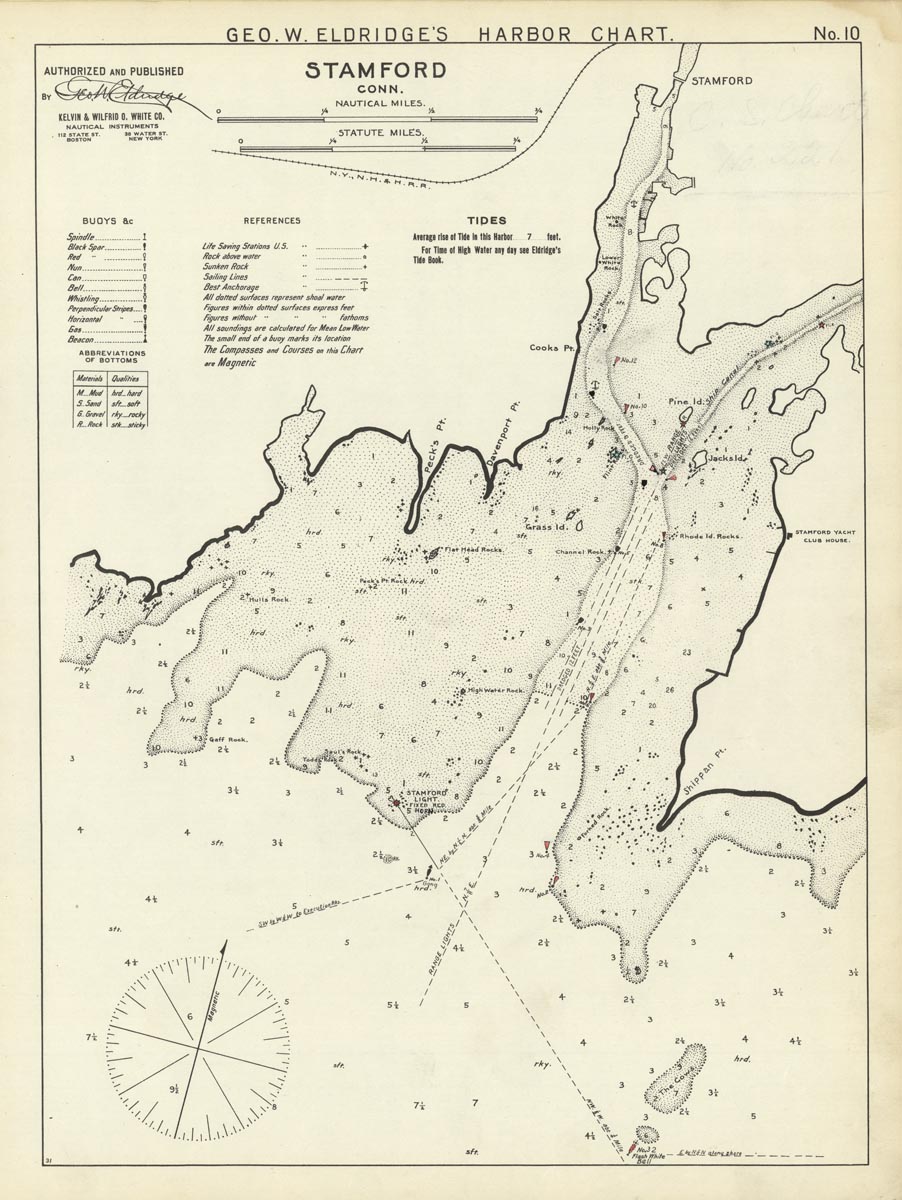 DESCRIPTION: A detailed close up chart of the harbor. Noted are soundings, channel markers, (colored in red), major towns and a compass rose. This chart appeared in George W. Eldridge’s “Harbor Chart-Book.”