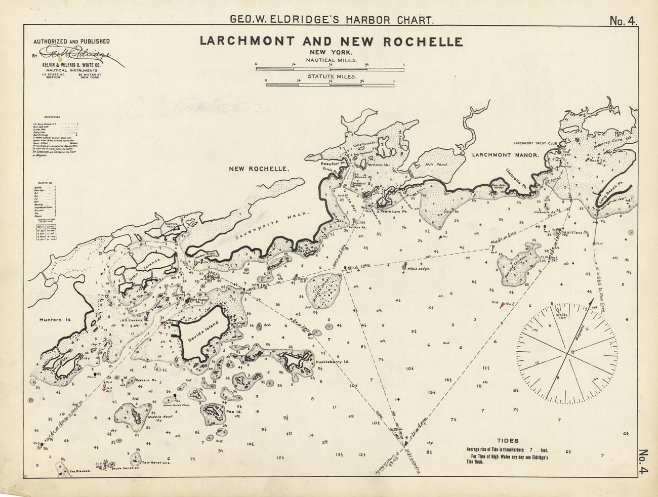 DESCRIPTION: A detailed chart of these harbors. Noted are soundings, channel markers, (colored in red), major towns and a compass rose. This chart appeared in George W. Eldridge’s “Harbor Chart-Book.”