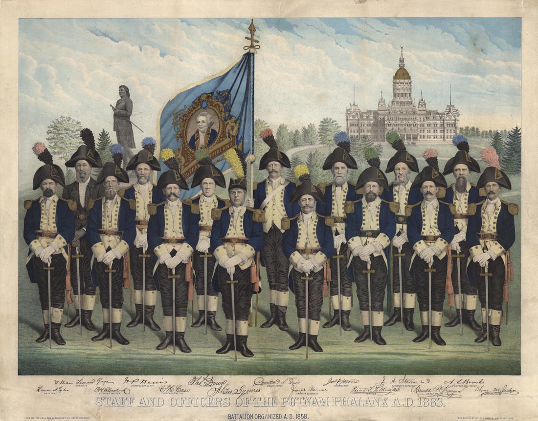 DESCRIPTION: Heightened with gold and silver. After photographs by R. S. Delamater, Hartford. An unusual and fascinating print, showing the men grouped with their flag before the state capitol building. In the title margin, original signatures appear below each man's portrait, with his position in the phalanx. The uniforms shown are strikingly elaborate for an American company.