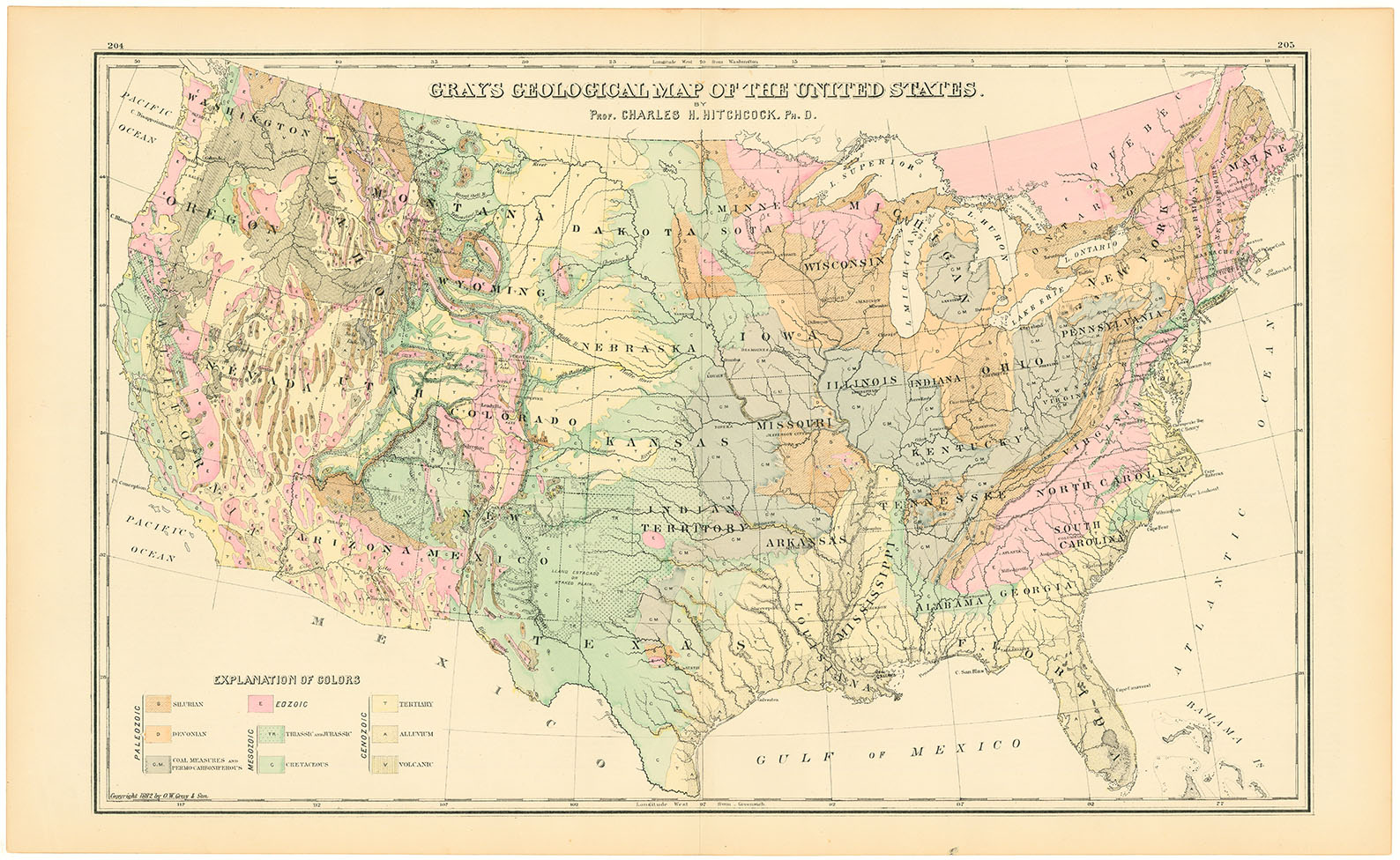 DESCRIPTION: well-engraved and visually engaging map, color-coded to show the geological structure of the United States by time period. The legend identifies regions by Eozoic, Paleozoic, Mesozoic, and Cenozoic formations. A striking example of 19th-century scientific cartography, combining precision with aesthetic appeal.