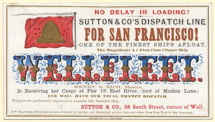 DESCRIPTION: This clipper ship card advertises the Wellfleet, featuring an elaborate display of the vessel's name in blue, red, and gold, entwined by delicate blue vines. A decorative flag engraving also is shown, with what looks like a beehive. The destination is also prominently displayed. These clipper ship cards were first used as a smaller alternative to broadsides, following in the tradition of trading cards, and became very popular and widespread in the 1860's. The imagery on the card typically supported the name of the ship, and thematically would largely fall into stock categories established such as nautical themes, women, knights/warriors, mythology and folklore, and patriotic themes, to name a few. The size, cargo capacity, destination, master's name, and not least of all, the word 'clipper' (complete with a bold, descriptive byline) would usually be incorporated into the design. <br><br>