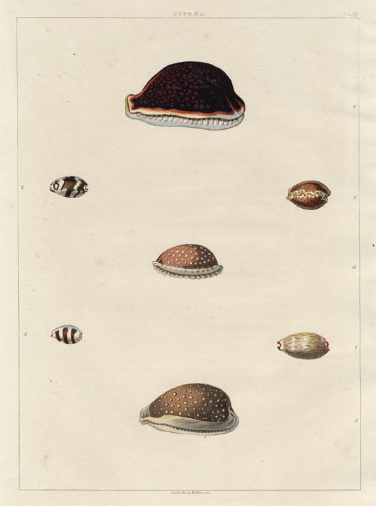 DESCRIPTION: A fine plate from Perry's "Conchology, or the Natural History of Shells." This series is best known for its large-sized and beautifully colored engravings. Engraved and colored after the original drawings by John Clarke.