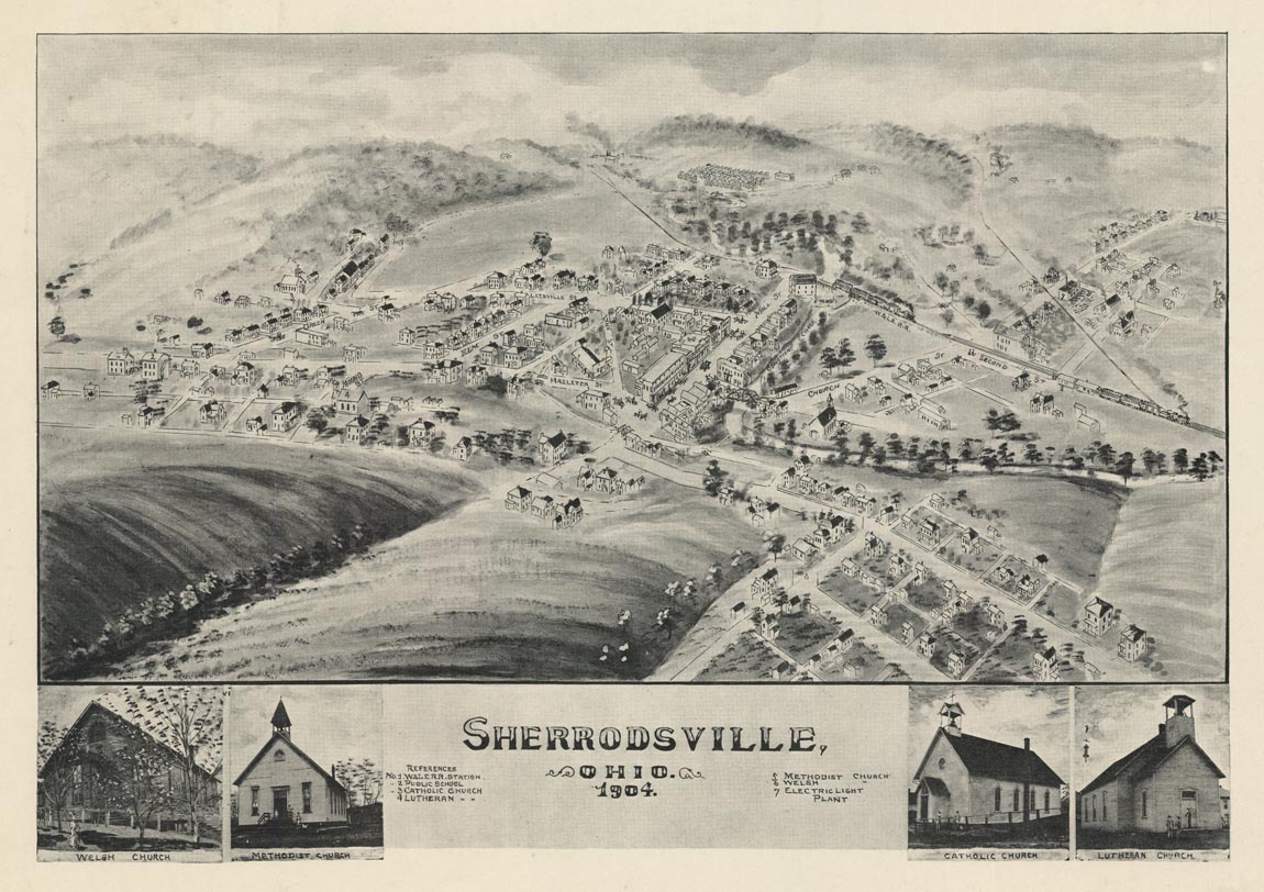 DESCRIPTION: Most likely by T. M. Fowler. An aerial view of the town with four vignettes of churches and a numbered reference key indicating seven points of significance.
