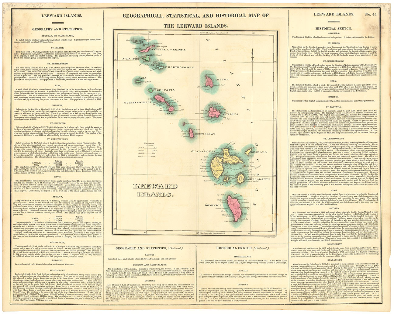 DESCRIPTION: This map, "Geographical, Statistical, and Historical Map of the Leeward Islands", by Fielding Lucas, Jr., 1822. Engraved by J. Yeager, this finely detailed map was published in Philadelphia as part of Carey & Lea’s celebrated A Complete Historical, Chronological, and Geographical American Atlas. It presents a sweeping view of the Leeward Islands in the eastern Caribbean, including Anguilla, St. Martin, St. Bartolomew, Saba, Barbuda, St. Eustatia, St. Christopher’s (St. Kitts), Nevis, Antigua, Montserrat, Redonda, Guadeloupe, the Saintes, Désirade, Marie-Galante, and Dominica. Each island is crisply rendered, with finely engraved coastlines and thoughtful labeling—ideal for study or display. What sets this map apart is its informative and engaging text panel, which offers geographical descriptions, population statistics, and a “historical sketch” for each island. Lucas, a pioneering American map publisher, was known for bringing clarity and context to his work, and this map is no exception. Produced during a time of shifting colonial control and maritime activity in the Caribbean, it captures both the physical beauty and the layered history of these islands. A delightful blend of cartographic artistry and historical insight, this is a standout piece for collectors and enthusiasts alike.