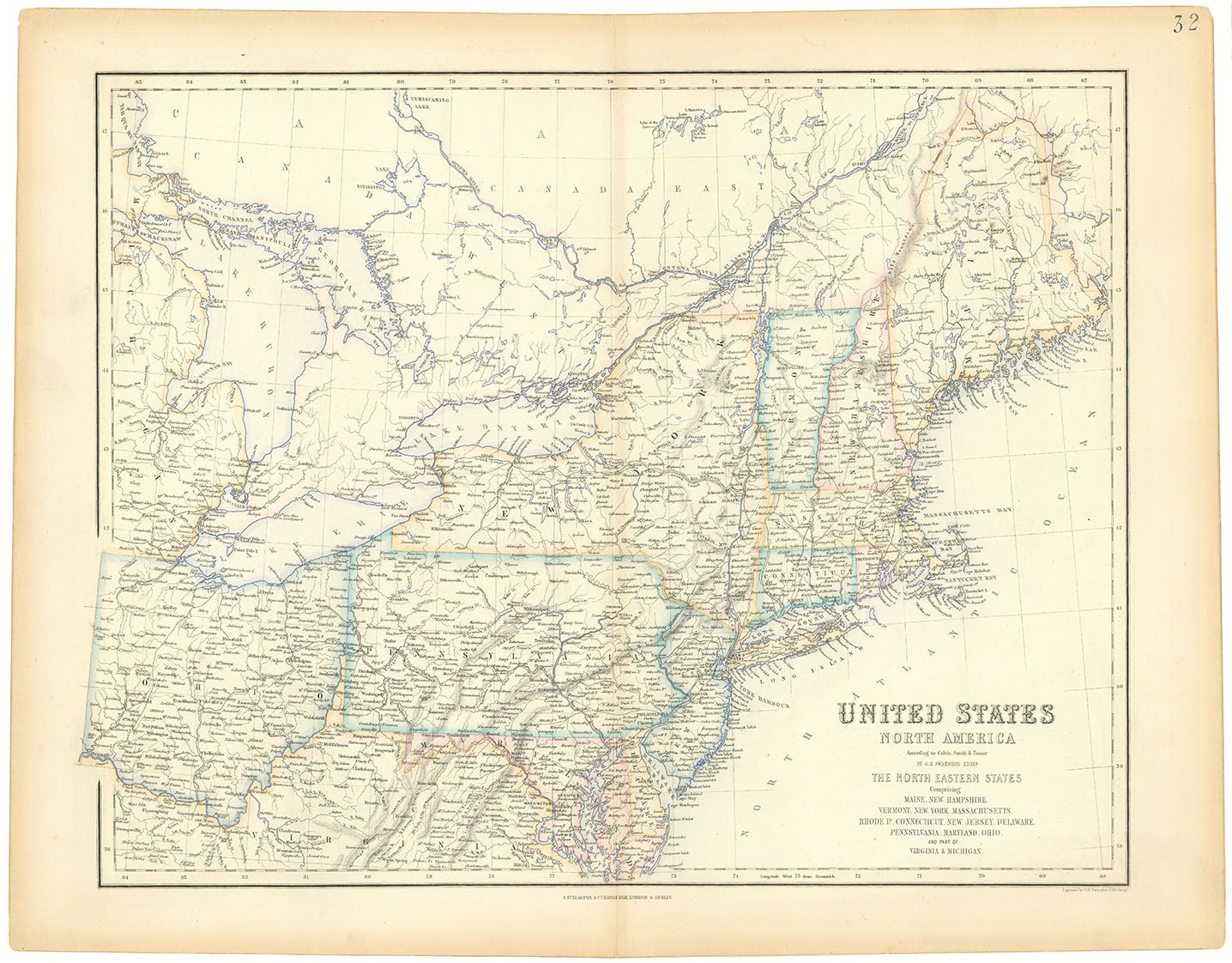 DESCRIPTION: A mid-19th century map showing the northeastern United States, including Maine, New Hampshire, Vermont, New York, Massachusetts, Rhode Island, Connecticut, New Jersey, Delaware, Pennsylvania, Maryland, Ohio, and portions of Virginia and Michigan.