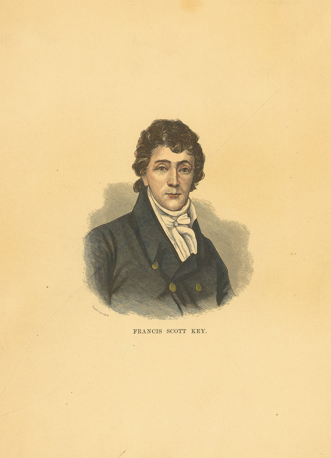 DESCRIPTION: This small, stately portrait depicts Francis Scott Key, best known as the author of “The Star-Spangled Banner.” A lawyer and amateur poet, Key penned the lyrics after witnessing the bombardment of Fort McHenry during the War of 1812, capturing a defining moment in American history. The engraving presents him with quiet dignity, reflecting his lasting role in the nation’s cultural memory.