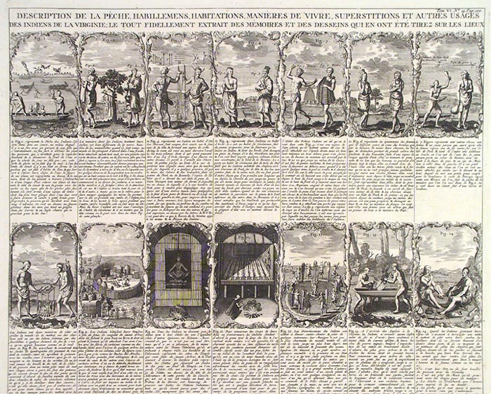 DESCRIPTION: Engraving from Volume II of the famous multi-volume Atlas Historique, published by L'Honore and Henri Chatelain, Amsterdam, 1719. Fourteen vignettes, adapted from John White's historic Virginia paintings, are grouped with descriptive text below. The scenes describe the culture's sins, habitations, clothing, manners of life, superstitions, etc. of the early Indians of Virginia. Black and white.