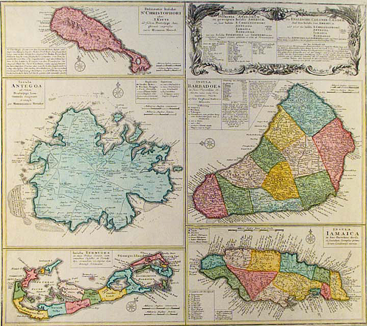DESCRIPTION: From the Grosser Atlas. A decorative and informative composite map depicting five Caribbean islands: St. Christopher, Antigua, Bermuda, Barbados and Jamaica. Each map shows coastal features, towns and shoals, usually with a key identifying area landmarks.