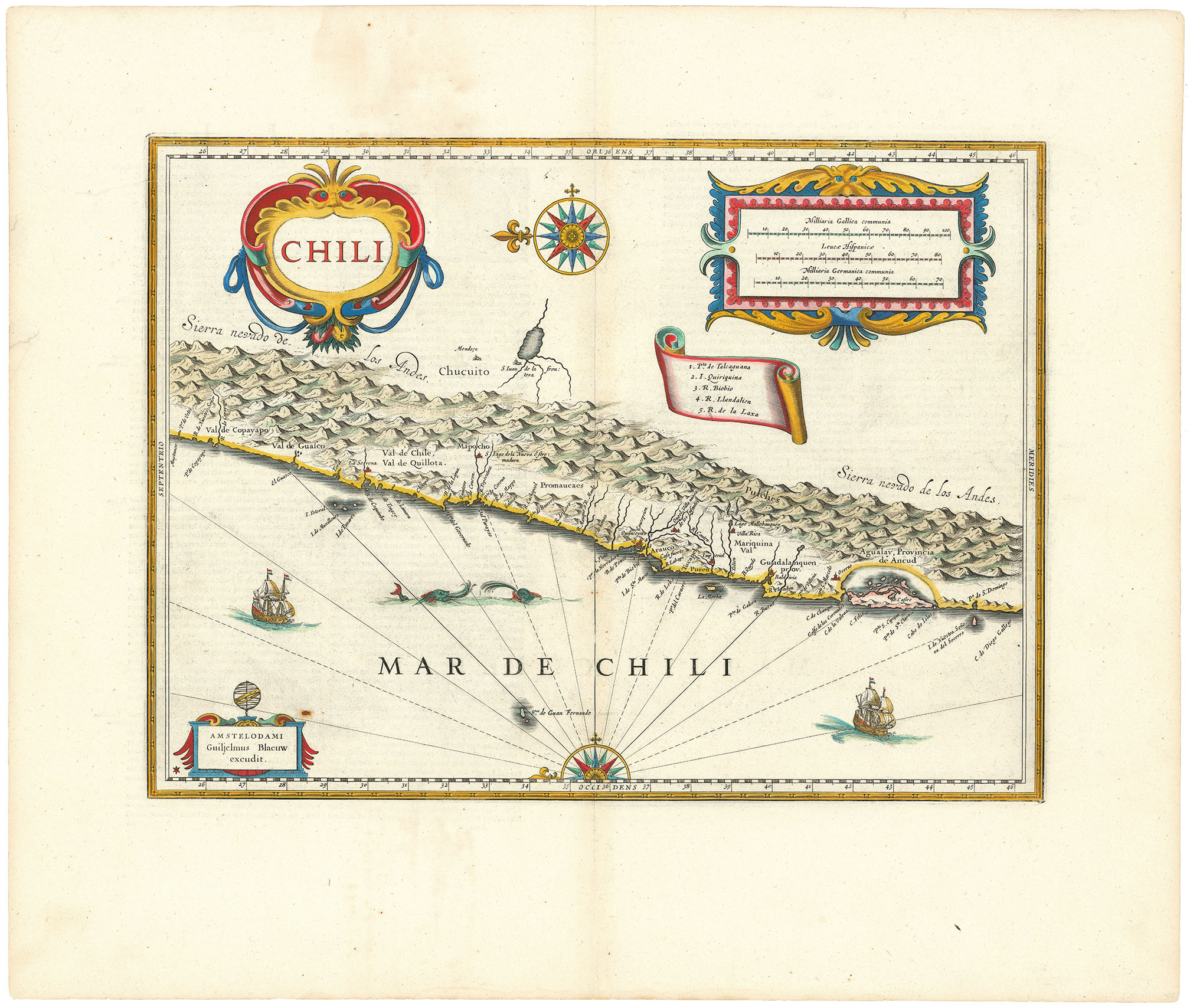DESCRIPTION: A fine map of Chile from a Dutch text edition of Blaeu's Atlas Novus. Oriented with north at the left, this map shows much of the west coast of South America. The Andes, rivers, cities and coastal features are located and identified. Several ornate cartouches decorate the map sheet, while ships and whales ply the Pacific (Mar de Chili).