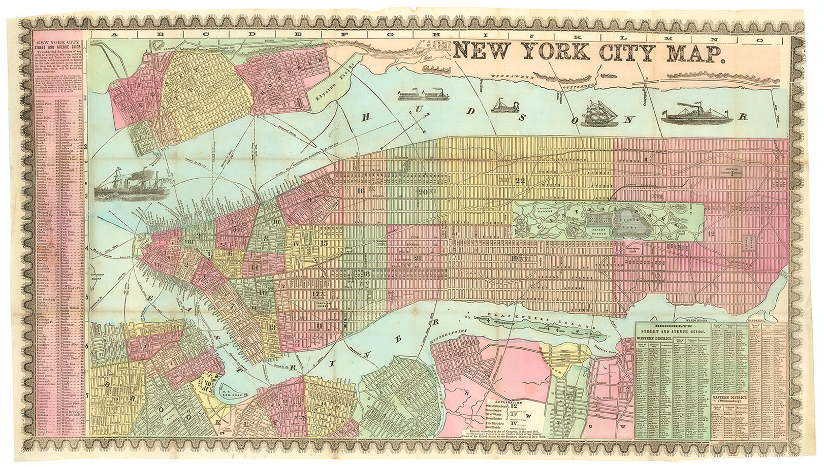 DESCRIPTION: An attractive early guide map of the city. The map is hand colored by ward and somewhat detained. Keys identify streets, wards, fire districts and railroads. Surrounding Manhattan is Jersey City, Hoboken and Elysian Fields, just outside of Hoboken, which is believed to be the site of the first organized baseball game. On the lower edge is Brooklyn Heights, Dumbo, Vinegar Hill, Williamsburgh, Greenpoint, Long Island City and a small portion of Astoria. Also shows early ferry routes between Manhattan, Long Island and New Jersey.