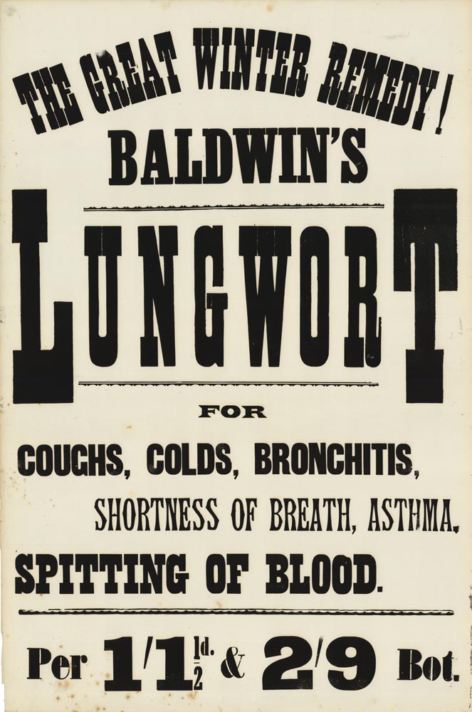 DESCRIPTION: Advertising poster published in England, c. 1880. Today such pharmaceutical broadsides are interesting both for their typography and their cure-all promises. The Great Winter Remedy! This one promises to cure everything from the common cold to bronchitis, asthma and spitting of blood. Black and white.