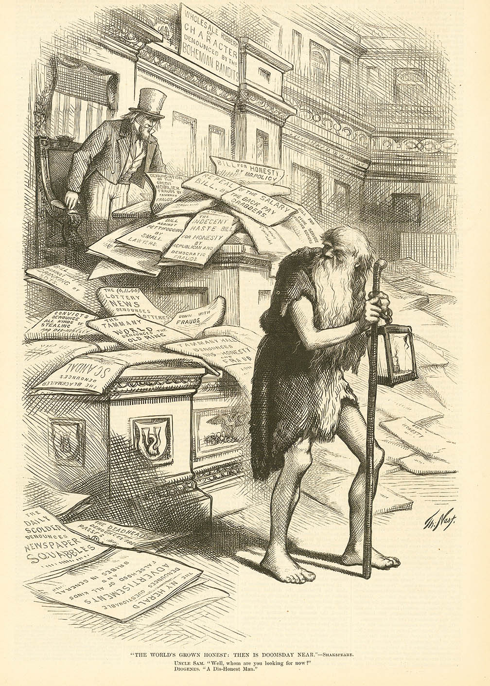 DESCRIPTION: Title continues "Uncle Sam. 'Well, whom are you looking for now?'; Diogenes. 'A Dis-Honest Man.'" <Br><Br> Diogenes was an ancient Greek philosopher and is considered one of the greatest practitioners of Cynicism, a belief that one should live a "natural" life, in harmony with nature and themselves, without luxury, and filled with virtue. Stories also tell of him wandering the streets with a lamp in broad day light, using it to assist him in finding ethical people. In this cartoon, however, he intends to use it to find the deceitful. Times were changing. The people were forcing changing. The corrupt officials in Tammany Hall had been ousted in 1871 and in its wake similar individuals and organizations were facing justice. The papers overflowing Uncle Sam's desk show this change with titles like "The N.Y. Herald denounces questionable advertisements falsehood of all kinds and bribes in general," and "Tammany Hall denounces dis-honesty and fraud." <br><br> With its title, Nast seems to question how long the peace will last and what demons will rise in its wake.