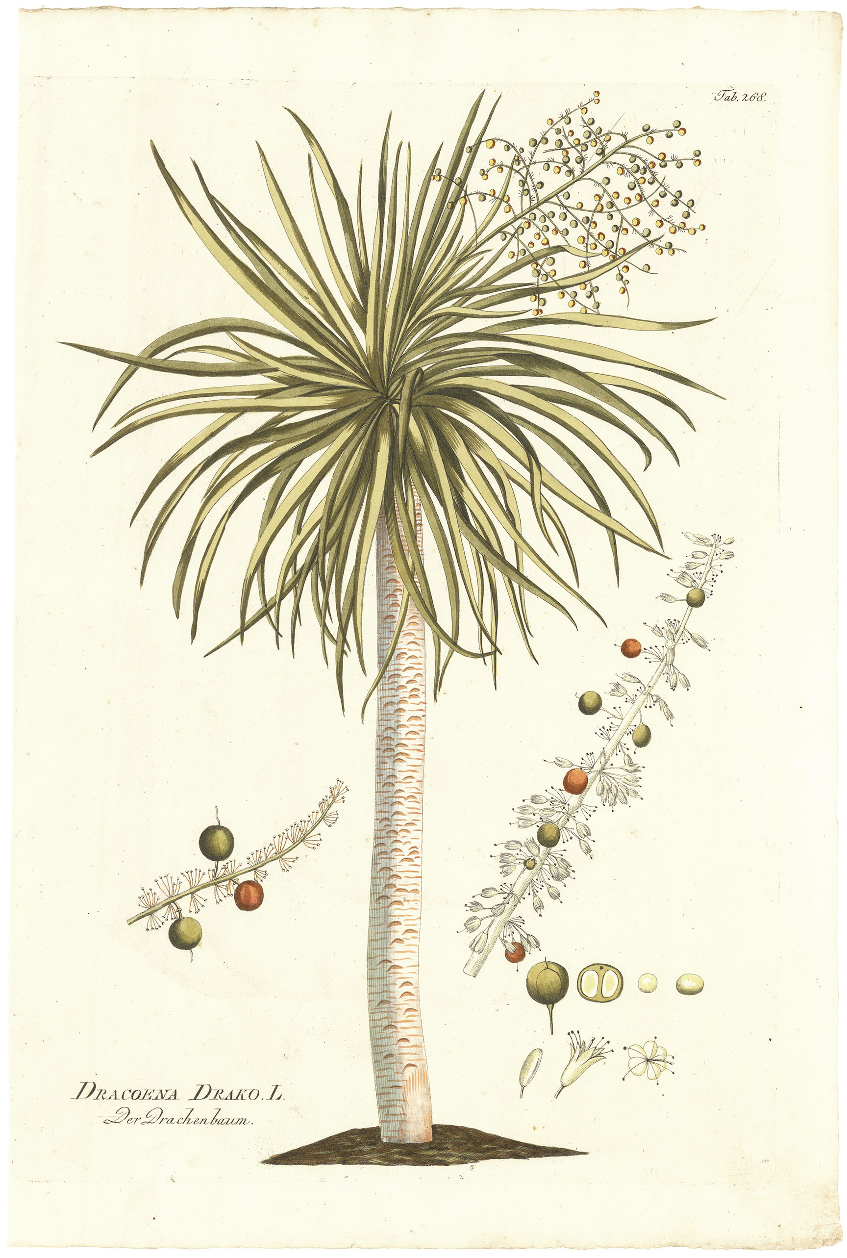 DESCRIPTION: This engraving originates from Joseph Jakob Plenck’s Icones Plantarum Medicinalium Secundum Systema Linnaei Digestarum, published in Vienna between 1788 and 1812. Devoted to the medicinal properties of European and exotic flora, this work documented species that had often never been illustrated previously. The plate depicts the Dragon Tree (Dracoena Draco), a succulent tree historically valued for the deep red resin—known as "dragon's blood"—used in traditional medicine as an astringent and wound-healing agent. Created using precise copperplate engraving and finished by hand with watercolor, the work provides a clear botanical study of the species' distinctive foliage and structural habit. These engravings, characterized by a distinct freshness and simplicity, remain a significant reference for both botanical collectors and historians of medicinal science.