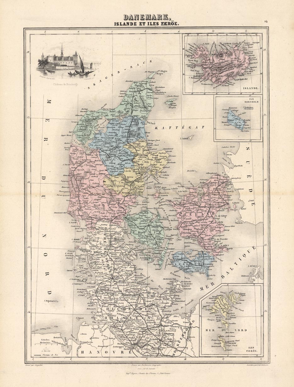 DESCRIPTION: From Migeon's Geographie Universelle. Published Paris. Map of Denmark with insets of Iceland, Bornholm and the Faroe Islands, plus a vignette of Kronburgh Castle.