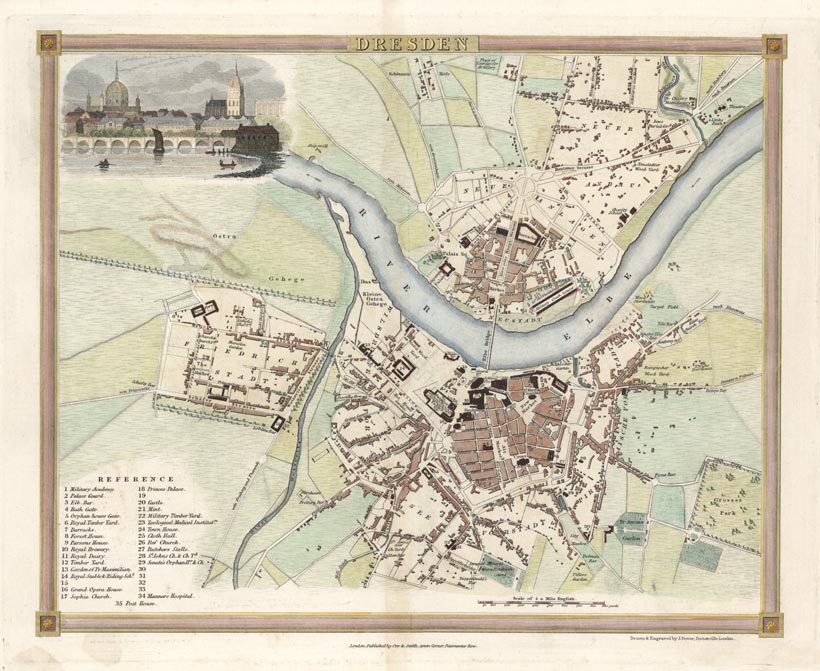 DESCRIPTION: Detailed city plan with a 35-item key and and inset view of the city from the river.