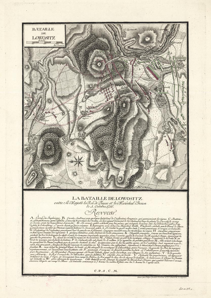 • DESCRIPTION: Scarce battle plan by Lt. Therbu, a French military engineer. The Battle of Lobositz aka Lovosice or Lowositz occurred on October 1, 1756. It was the opening land battle of the Seven Years' War. Frederick the Great's 28,000 Prussians were prevented by 33,000 Austrians under Maximilian Ulysses Count von Browne from continuing their invasion into the rich Bohemian plain. Troop positions are marked.