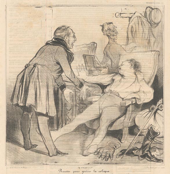 DESCRIPTION: No, 72 from the series Caricaturana. Imp. d'Aubert & Cie. From the newspaper Le Charivari. Translation of title: " Recipe to cure colic: -Monsieur Macaire, my good friend, don't make me cancel this performance, I need it desperately! -Oh my friend, I cannot play, I am in such pain...-Try, I beg you... the public is demanding you; they're shouting, atening, ready to rip out the seats. I'll have to return their money...Come, I'll double your bonus. -Oh, oh, heat some towels...bring some hot wine, heat the towels...I'll triple your bonus. -Keep the heat on...keep heating the towels.- We'll share the box office receipts.- We'll share the box office receipts? Up with the curtain. The farce is ended, the drama begins..."