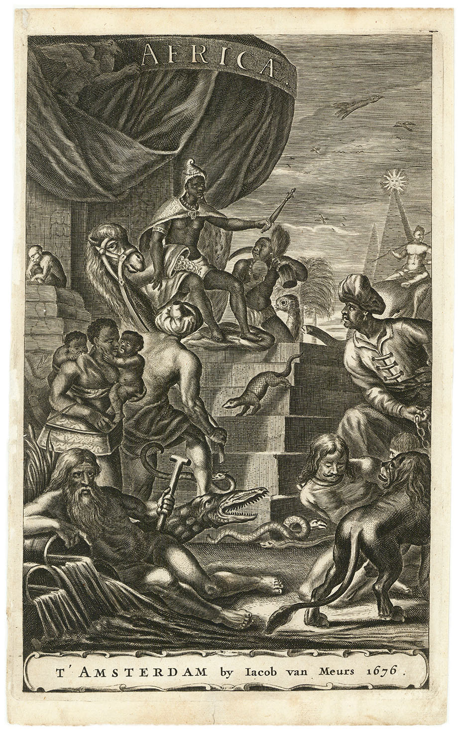 DESCRIPTION: This allegorical frontispiece comes from Olfert Dapper’s Naukeurige beschrijvinge der Afrikaensche gewesten van Egypten, Barbaryen, Libyen, Biledulgerid..., from the 1676 printing. It presents a symbolic vision of the African continent. The image is rich with representations of Africa’s diverse peoples, wildlife, and landscapes. Figures in regional dress appear alongside unusual animals and notable architectural elements, including a group of Nubian pyramids. Together, these details were intended to convey the continent’s richness, antiquity, and cultural variety as imagined by 17th-century audiences.