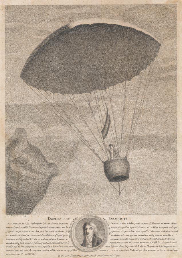 DESCRIPTION: Simon Petit, Peintre, del sculp. Rare stipple engraving by Simon Petit after his own work. With an oval inset portrait of Andre Jacques Garnerin amidst nine lines of text describing his feat. On October 22, 1797, Garnerin became the first man to descend from a balloon by parachute, accomplished after his ascent over the Parc de Monceau in Paris. He also made the first parachute descent over England, landing in Grosvenor Square. His wife was the first professional woman aeronaut.
