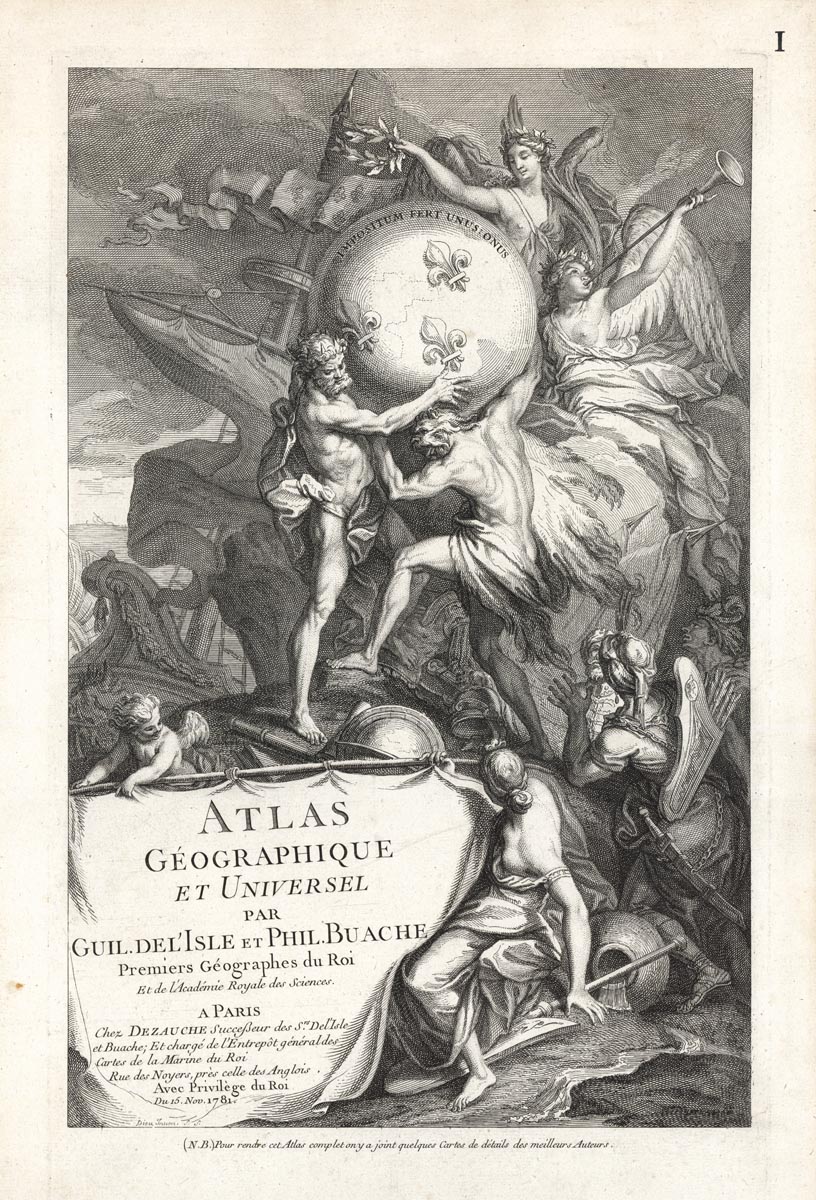 DESCRIPTION: Allegorical titlepage for an atlas of Guillaume De l'Isle and Philippe Buache. Classical figures including Atlas, a herald and a cherub support a globe and a banner carrying the title and publication information.