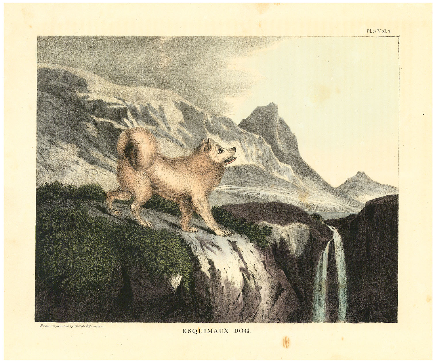 DESCRIPTION: Printed by Childs & Inman Press. From the "Cabinet of Natural History, and American Rural Sports" - 48 lithographs issued monthly via subscription. The first major book published in the United States to be illustrated with hand-colored lithographs. <br><br> Lithograph depicting an Inuit sled dog, part of Doughty’s studies of Arctic life and northern landscapes. This work is from his series illustrating animals in their natural and utilitarian roles, highlighting the relationship between humans and working dogs in northern communities.