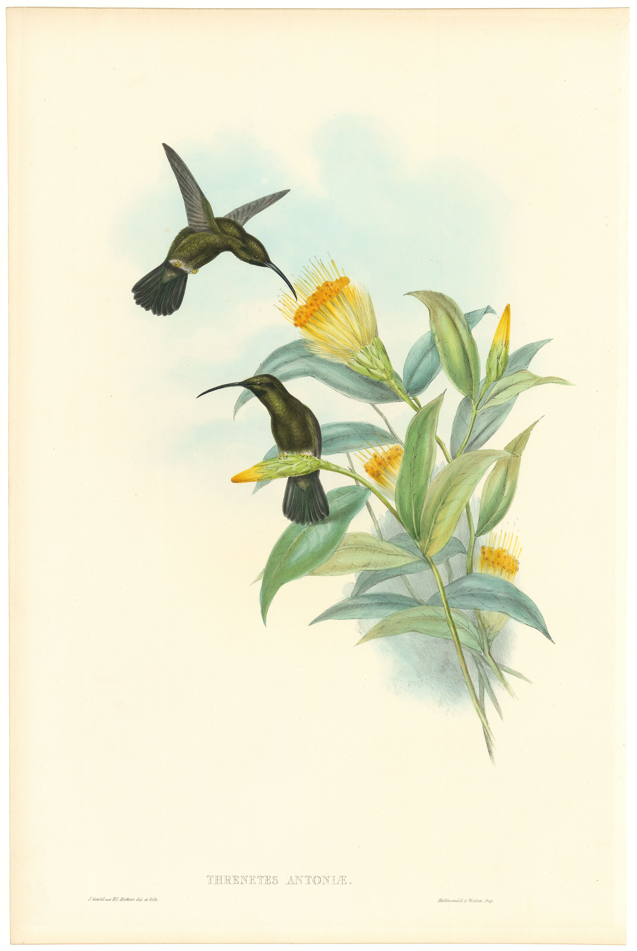 DESCRIPTION: From A Monograph of the Trochilidae, or Family of Humming-Birds, 6 vols., large folio. Published in London, 1849–1887. Printed by Hullmandel and Walter from drawings by J. Gould, H. C. Richter, and William Hart, lithographed by the artists. The Sooty Barbthroat is a somberly colored yet elegant hummingbird, recognized by its dark olive-brown plumage, slightly decurved bill, and the fine bristle-like feathers at the base of its bill that form the “barbthroat.” In Gould’s hand-colored lithograph, the bird is portrayed feeding from a tubular blossom, its poised form and subtle tones rendered with exquisite care. The application of metallic pigment brings a quiet luminosity to the image, highlighting the delicate structure of the bird’s feathers and the natural simplicity of its surroundings. John Gould’s Monograph of the Trochilidae is among the grandest works of nineteenth-century ornithological art. Produced over nearly four decades, it reflects Gould’s deep scientific curiosity and his collaboration with master lithographers Henry Constantine Richter and William Hart. The Sooty Barbthroat plate captures the balance of accuracy and artistry that defines the series—celebrating even the most modestly plumaged species with the same reverence afforded to nature’s most radiant birds.