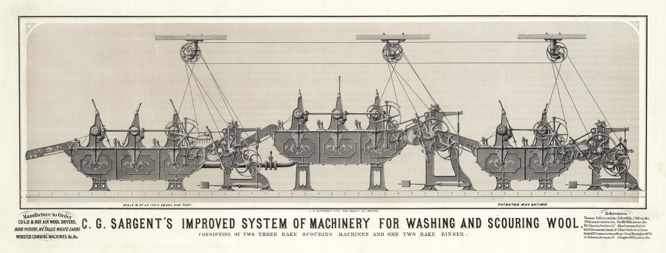 DESCRIPTION: J. H. Bufford's Lith. 490 Washgn. St. Boston. Two columns to the right and left of the title. Legend under the print shows a scale 3/4 of an inch equals a foot. The total length of the machine is 46'.