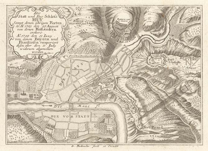 DESCRIPTION: A small and well engraved map of the walled city of Huy located on the Meuse River in the Liège province of Belgium. Gabriel Bodenehr the Elder (c. 1664-1758) was a Swiss artist who worked in Augsburg. He created many topographical views and plans of European and North African cities. Many were gathered under the overall title Le Gloire et la Force de l'Europe.