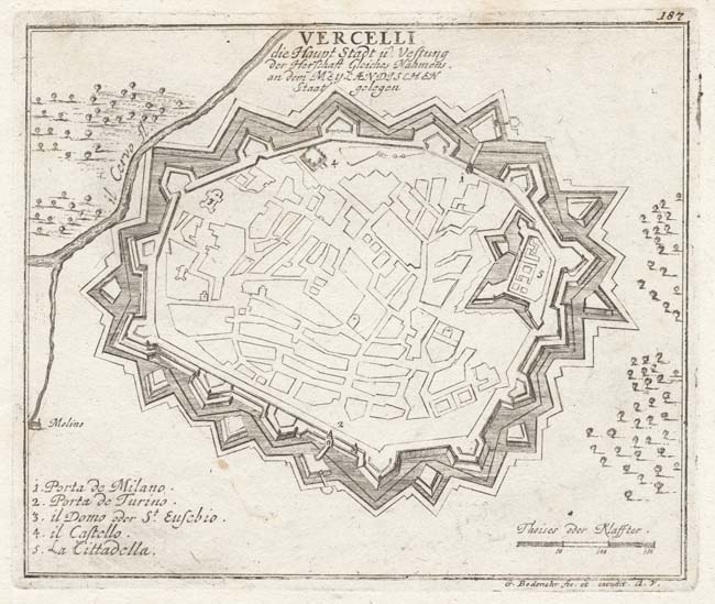 DESCRIPTION: A beautifully engraved map of the walled city of Vercelli, Italy. Gabriel Bodenehr the Elder (c. 1664-1758) was a Swiss artist who worked in Augsburg. He created many topographical views and plans of European and North African cities. Many were gathered under the overall title Le Gloire et la Force de l'Europe.