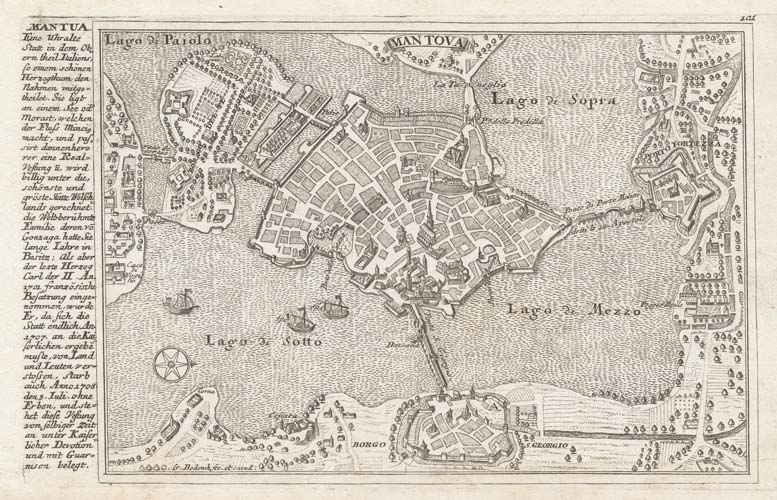 DESCRIPTION: A beautifully engraved map of the city of Mantua, located in the Lonbardy province of Italy. Gabriel Bodenehr the Elder (c. 1664-1758) was a Swiss artist who worked in Augsburg. He created many topographical views and plans of European and North African cities. Many were gathered under the overall title Le Gloire et la Force de l'Europe.