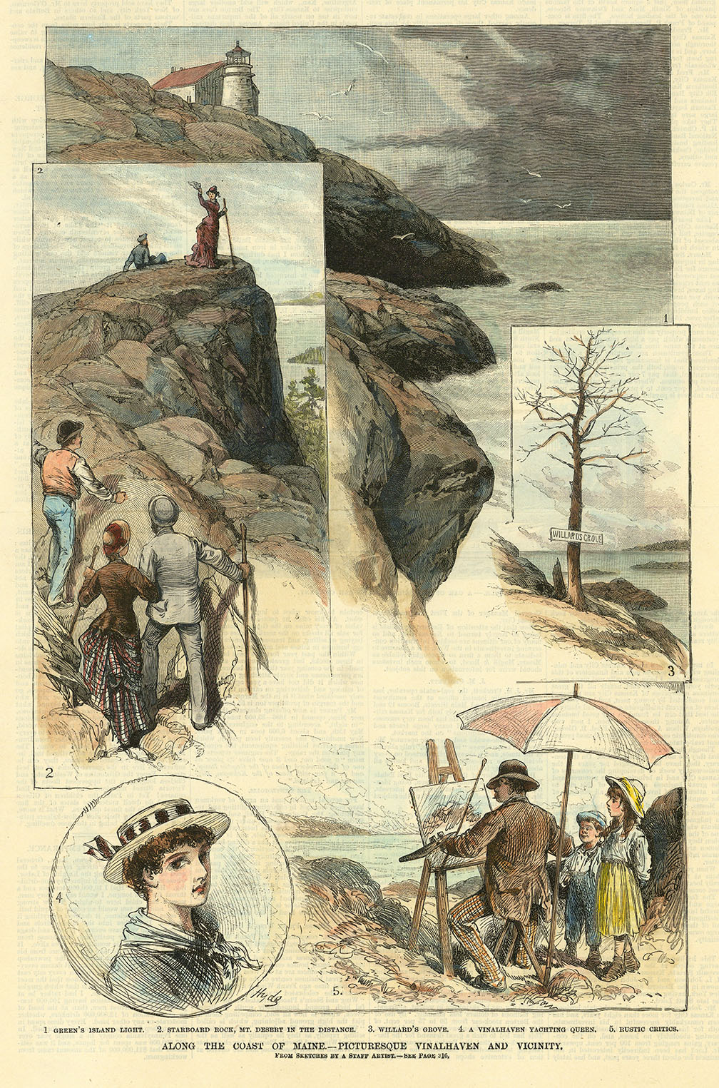 DESCRIPTION: A 19th-century composite of five scenes, including Green's Island Light, Starboard Rock, Mt. Desert, Willard's Cove, Vinalhaven Yachting Queen, and a scene of a man painting the landscape. Captured as a wood engraving and handcolored to highlight the details.