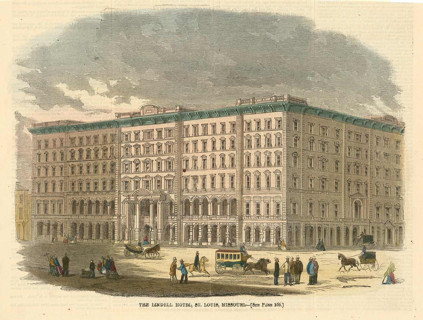 DESCRIPTION: A 19th-century perspective of the Lindell Hotel in St. Louis, Missouri, captured as a wood engraving and colorized to highlight the details. The Lindell Hotel, situated on Sixth Street and Washington Avenue, opened its doors in 1863 but met its demise in 1867 when it was destroyed by fire.