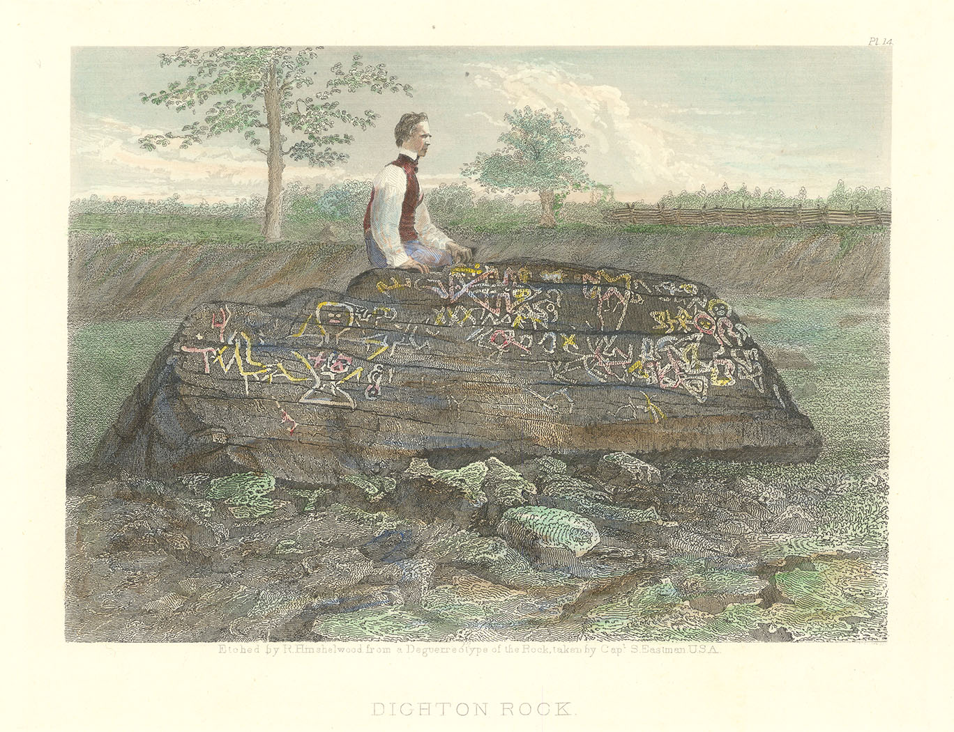 DESCRIPTION: Engraving by R Hinshelwood after a daguerreotype taken by Captain Seth Eastman. From Henry R Schoolcraft's monumental "Historical Information....Respecting the Indian Tribes of North America." <br><br> The print "Dighton Rock" by Seth Eastman depicts the famous petroglyph-covered boulder located in the Taunton River, Massachusetts. Eastman’s detailed rendering captures the mysterious carvings on the rock, which have long puzzled historians and archaeologists, offering a glimpse into the site's historical and cultural significance.