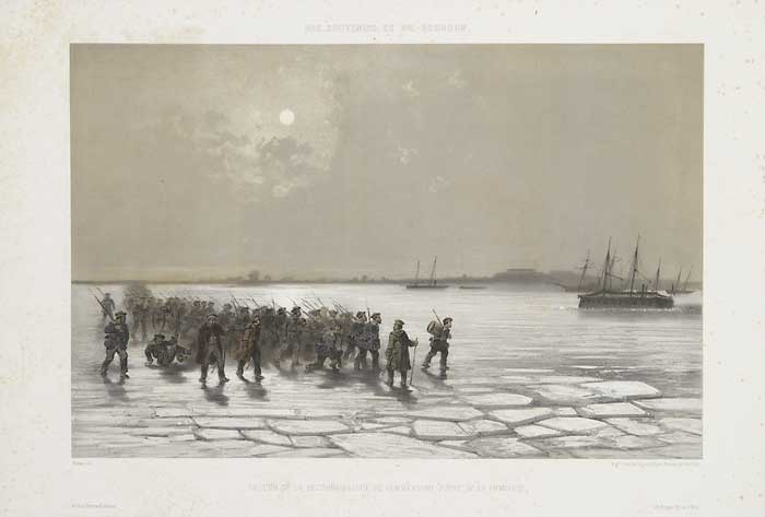 DESCRIPTION: Rideau, del. Euge. Ciceri Lith. fig. par A Bayat. Navires par Morel Fatio. Lith. Becquet Freres, a Paris. From "Nos Souvenirs de Kil-Bouroun Pendant L'Hiver Passe dans le Liman du Dnifeper. 1855-1856." The lithograph represents a scene during the Crimean War (French, England against Russia) in the one naval battle that happened where the British and French forces destroyed the Russian Navy.