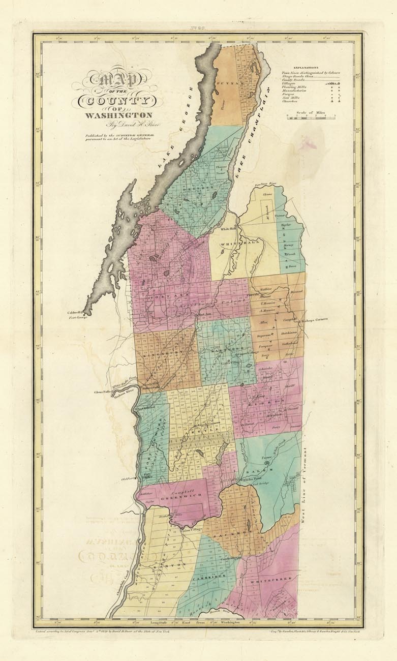 DESCRIPTION: A fine map from Burr's "An Atlas of the State of New York Containing a Map of the State and of the Several Counties. Projected and Drawn by a Uniform Scale... under the Supervision & direction of Simon De Witt, Surveyor General.…" "It is a magnificent publication and was the second atlas of an individual state ever published." (Ristow). Engraved by Rawdon Clark & Co. Albany & Rawdon, Wright & Co. N.Y. The map divides the county into numbered land allotment tracts, and names major landowners. Lake George and Lake Champlain are on the northern edge of the map.