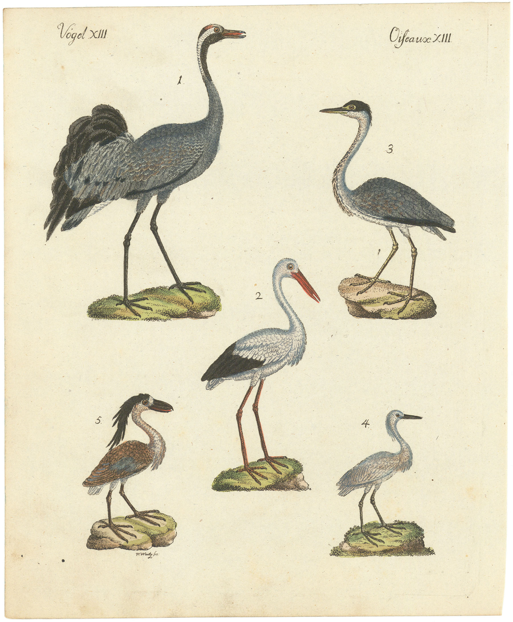DESCRIPTION: Vogel XIII. Oiseaux XIII. From Bilderbuch für Kinder by F. J. Bertuch, this lively print features a group of five graceful herons and other leggy birds. The artwork captures their elegant forms with delicate detail and a charming, playful style, accompanied by French and German text. A delightful piece blending natural beauty with classic illustration.